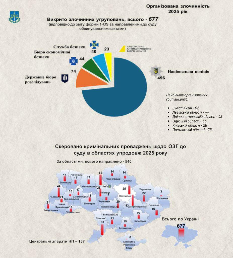 Загалом в Україні за 2025 рік було знешкоджено 677 злочинних угруповань, до складу яких входило понад 3 тисячі осіб. Більшість із них — 496 угруповання викрили підрозділи Національної поліції.