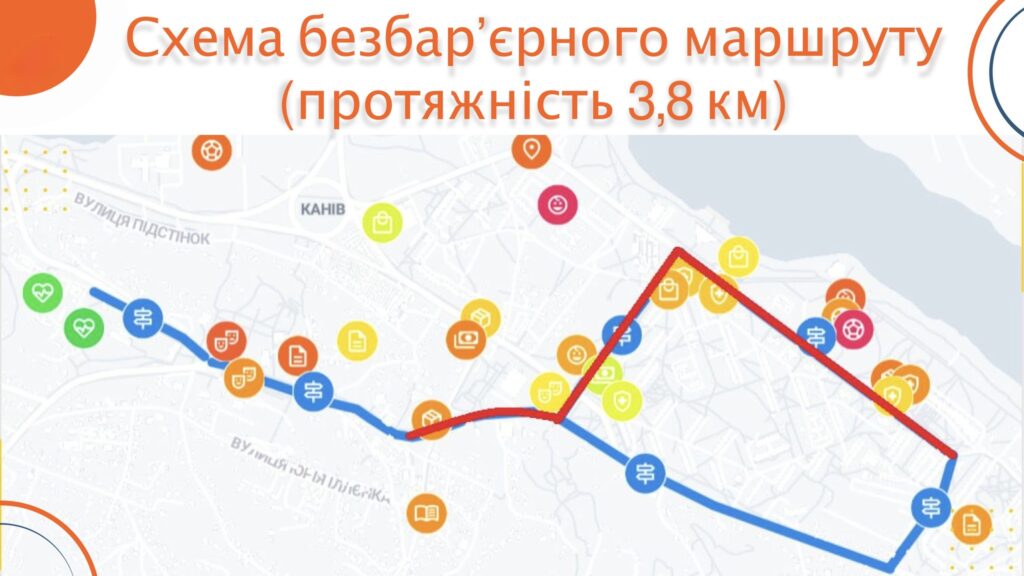 Відтак, згідно з рішенням Ради безбар’єрності, затверджено конкретний маршрут. Він проходитиме центральною частиною Канева та об’єднає вулиці Захисників України, Героїв Дніпра, Шевченка, Романа Шухевича, Героїв Небесної Сотні, площу Соборну, а також частину вулиці Успенської, що повз гімназію ім. Івана Франка веде до медичних закладів — центру первинної медико-санітарної допомоги та багатопрофільної лікарні. У межах маршруту розташовані автовокзал, ЦНАП, поштові та банківські установи, аптеки, заклади торгівлі й сфери послуг. Загальна протяжність маршруту становить 3,8 км.
