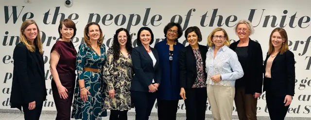 (Зліва): Марія Чухнова, Зоряна Головата, Посол Андрій Мельник — Постійний представник України при ООН, Христина Гайовишин — заступниця Постійного представника України при ООН — у штаб-квартирі ООН, Delegates’ Lounge