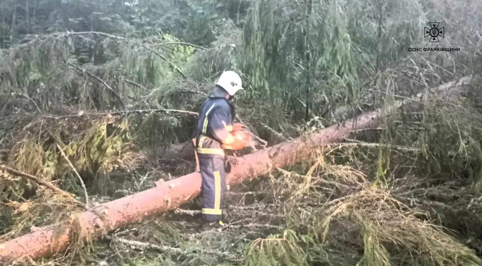 Минулої доби на Прикарпатті вирувала негода: сильні пориви вітру, гроза та дощ спричинили повалення дерев у кількох районах області.